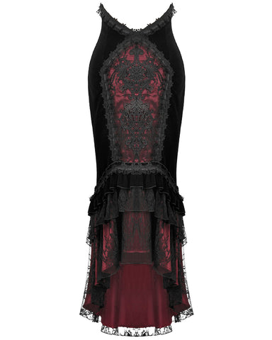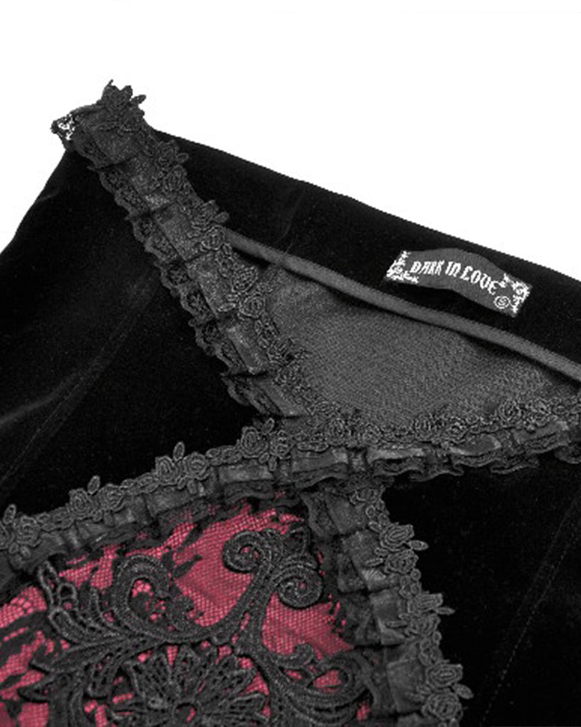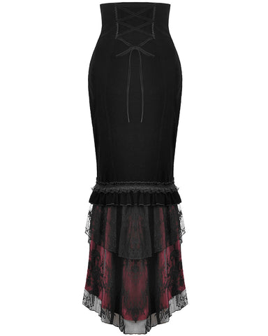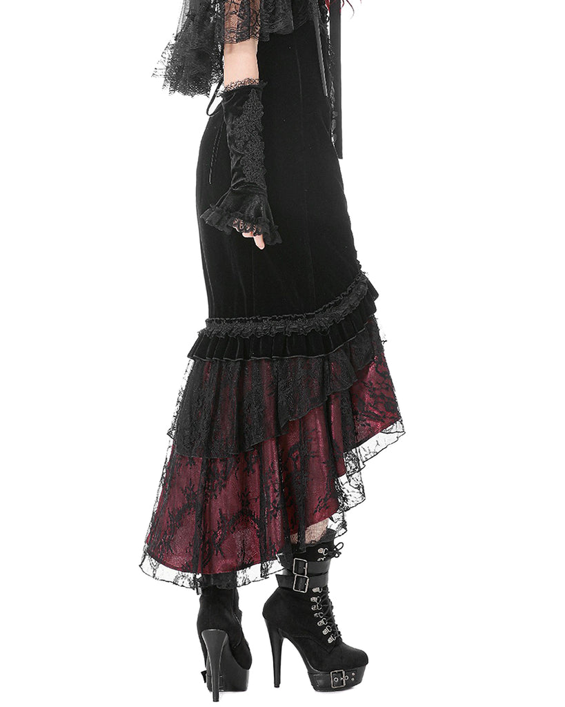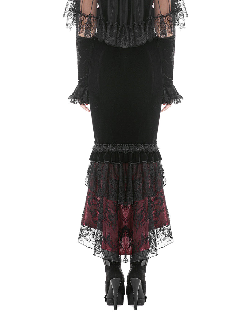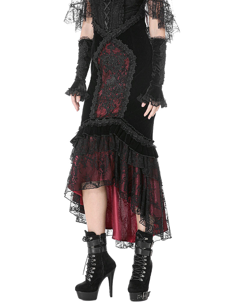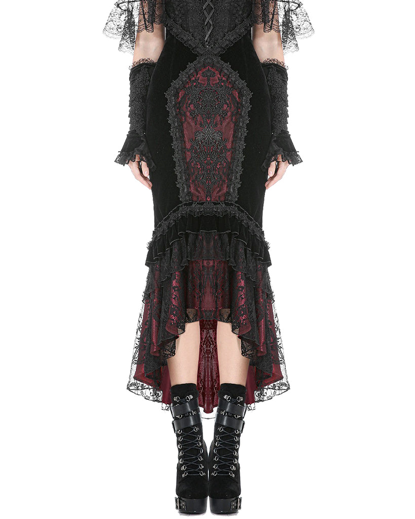 Dark In Love Womens Elegant Gothic Velvet Embroidered Mermaid Skirt - Black & Red