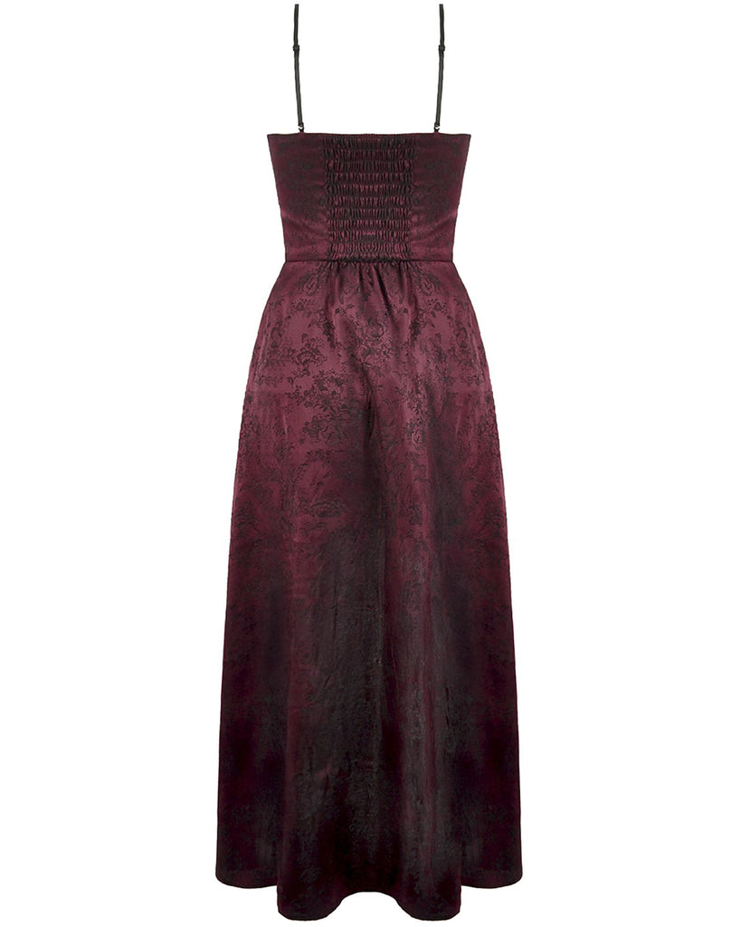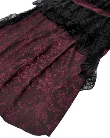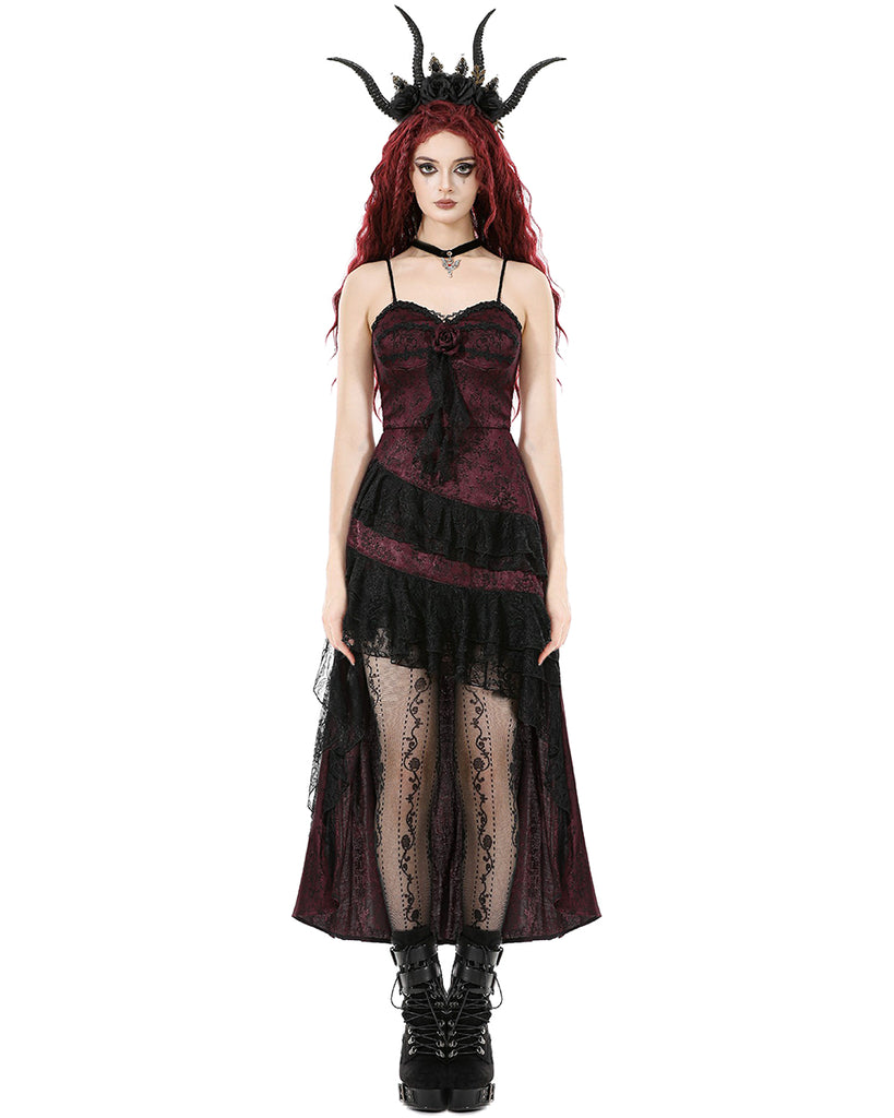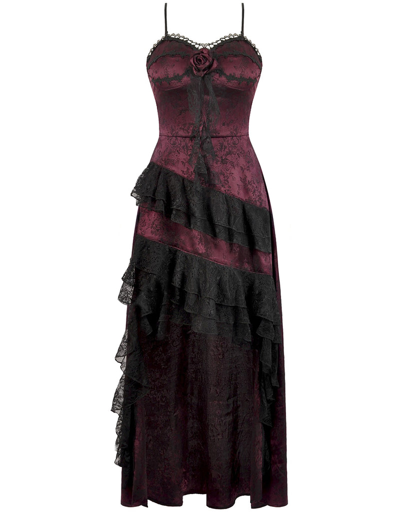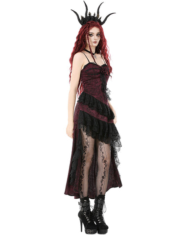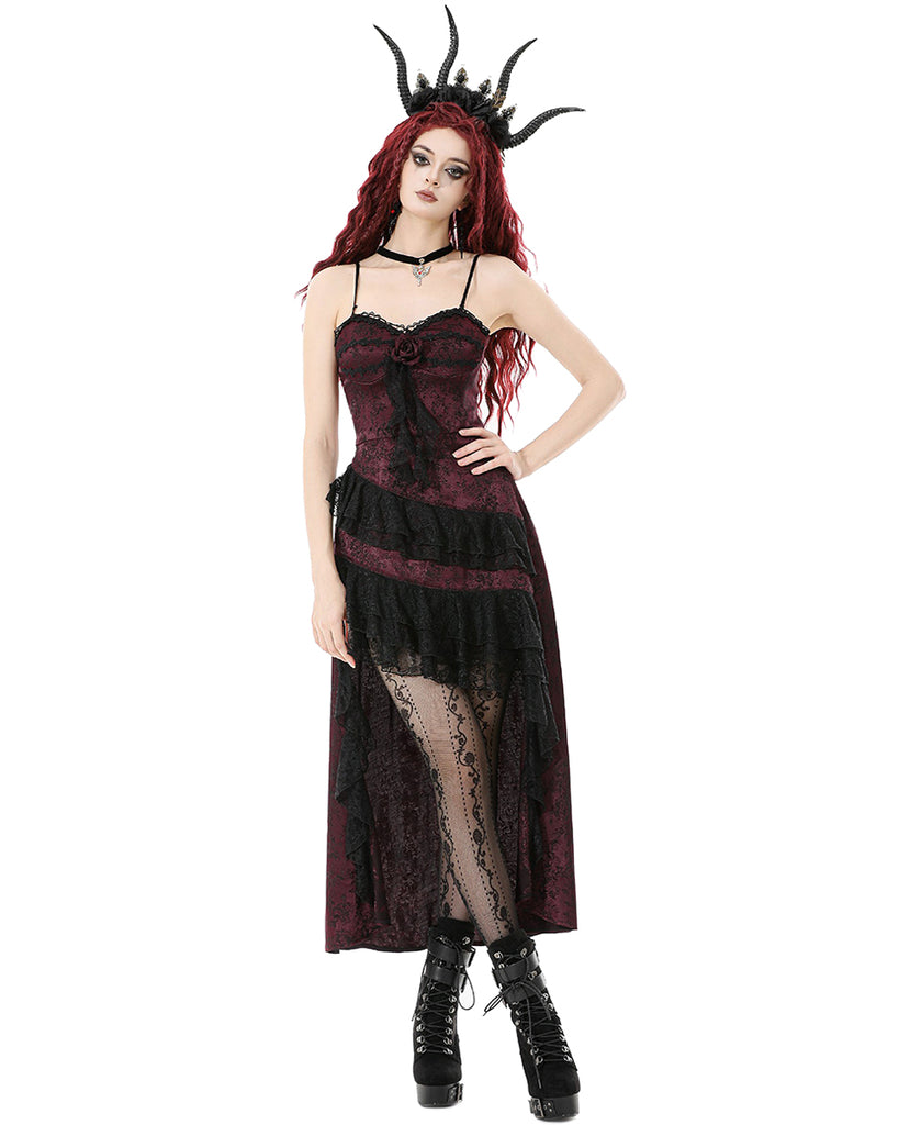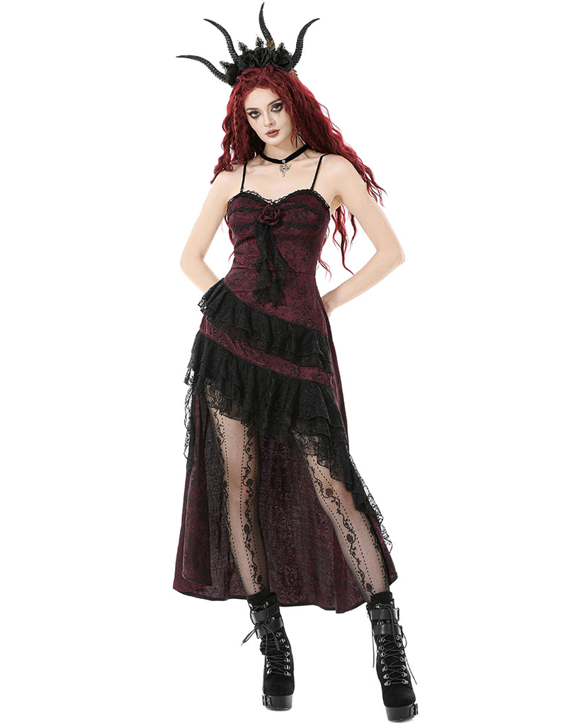Dark In Love Womens Long Gothic Rose Asymmetric Lace Ruffle Maxi Dress - Red & Black