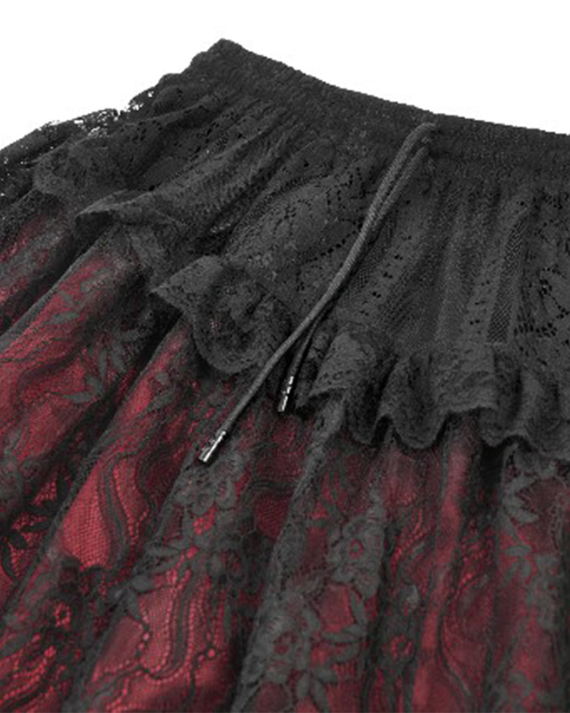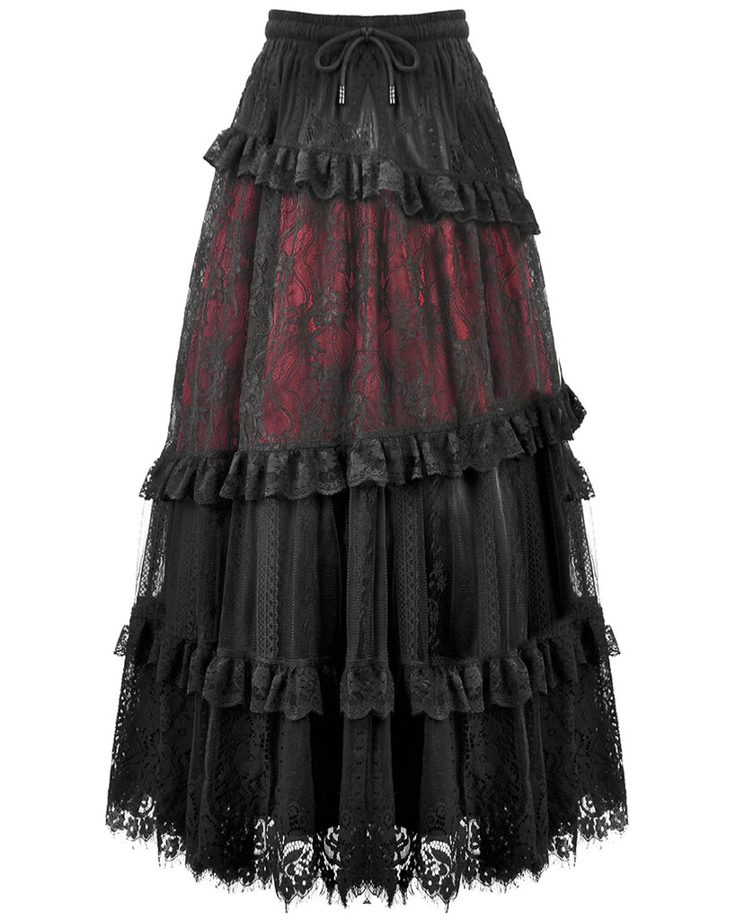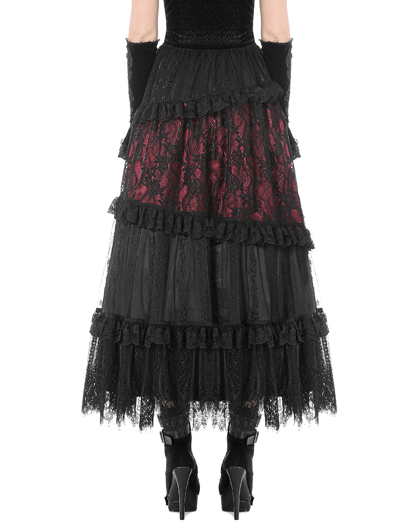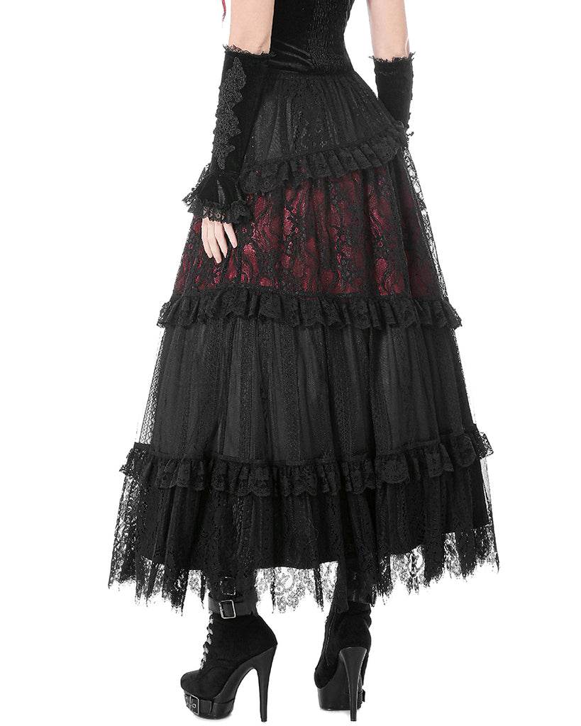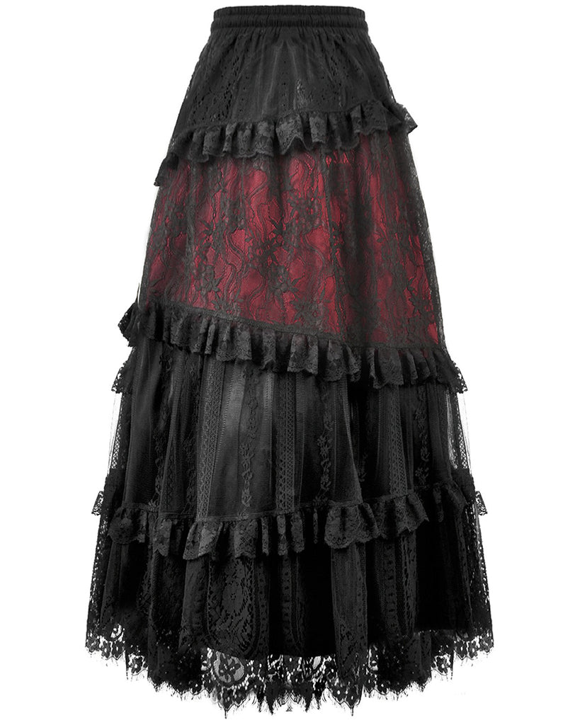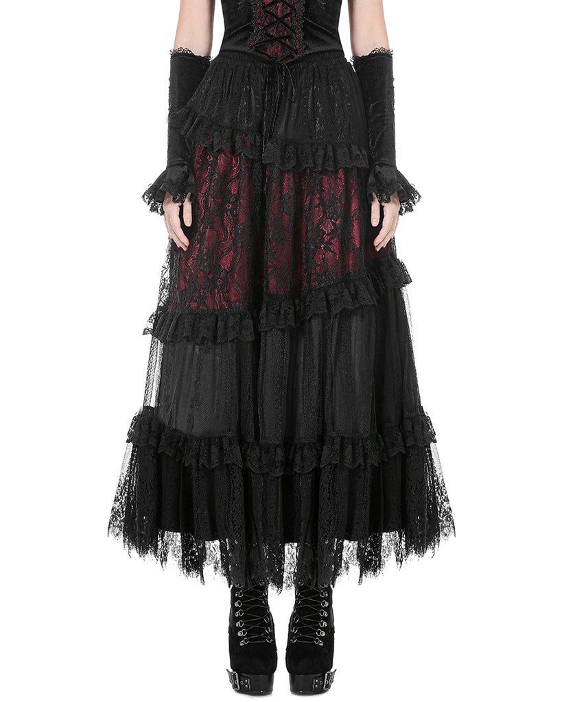 Dark In Love Womens Long Gothic Spliced Lace Maxi Skirt - Red & Black